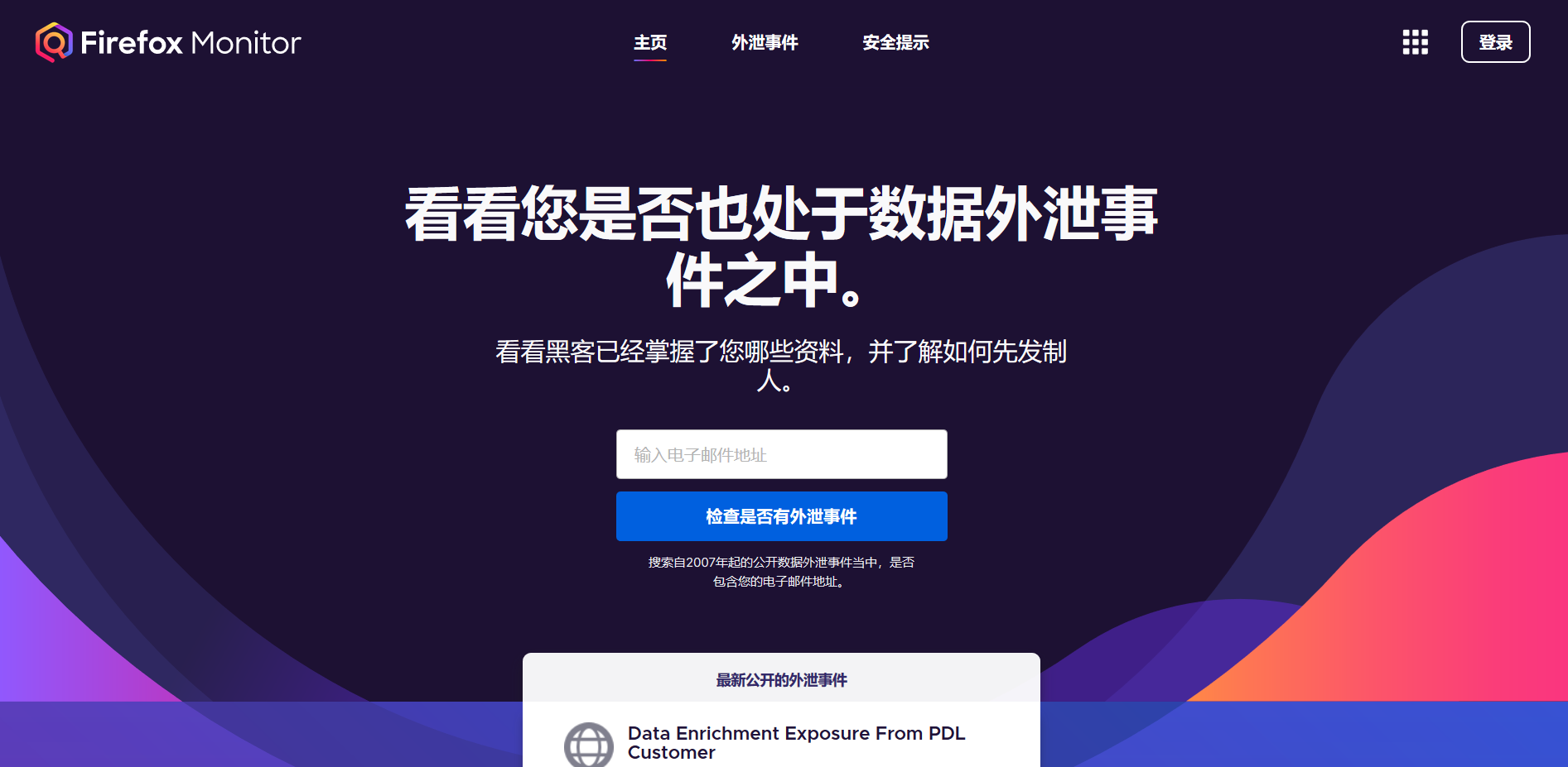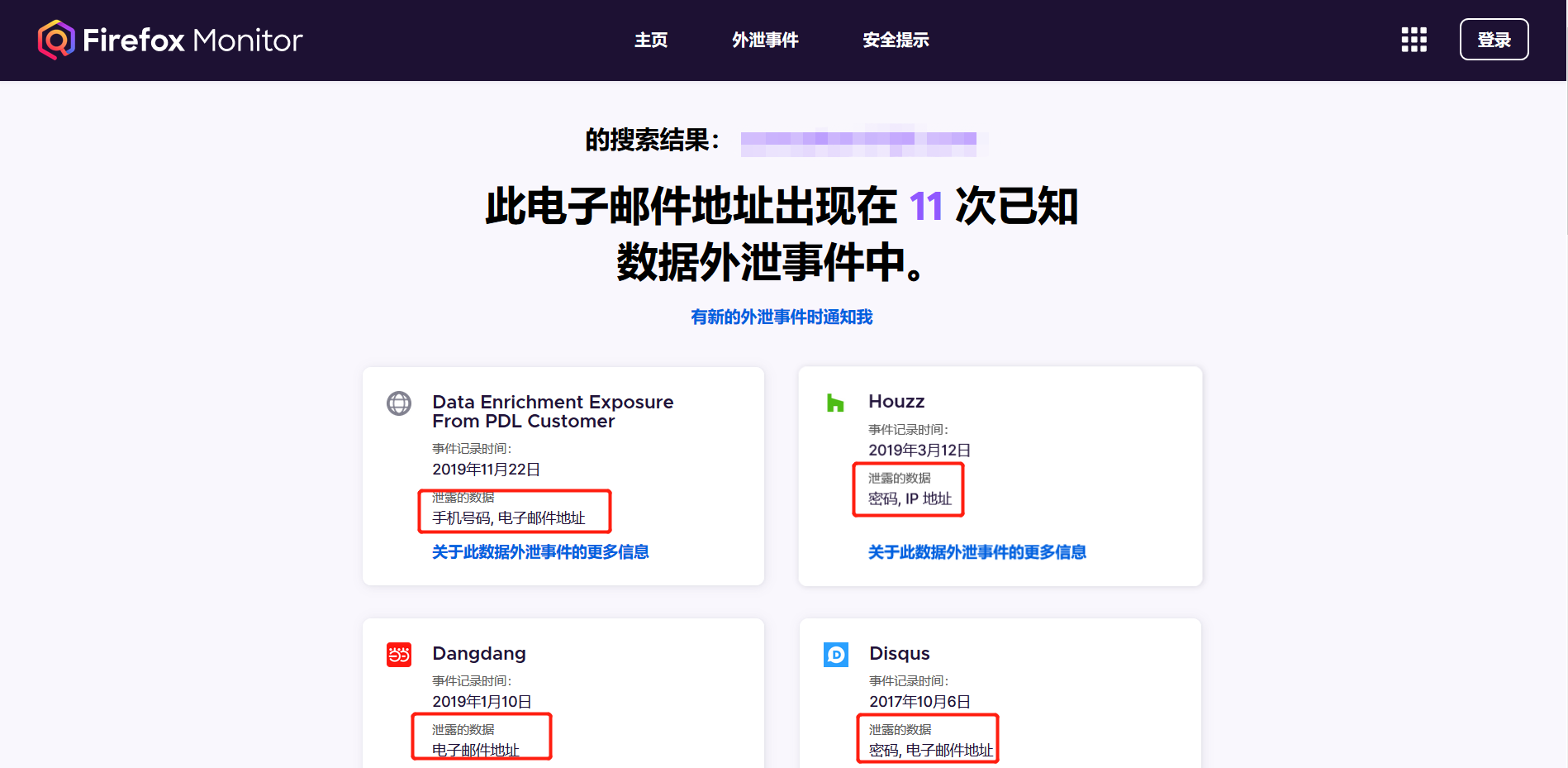 刚好我用了Firefox浏览器,他们提供了一个账号监控的平台:Firefox Monitor。只要输入你的邮箱、电话等就可以查看在一些已经爆出的泄露事件中,是否包含你的信息。这是一个网站,地址是:https://monitor.firefox.com/ 。