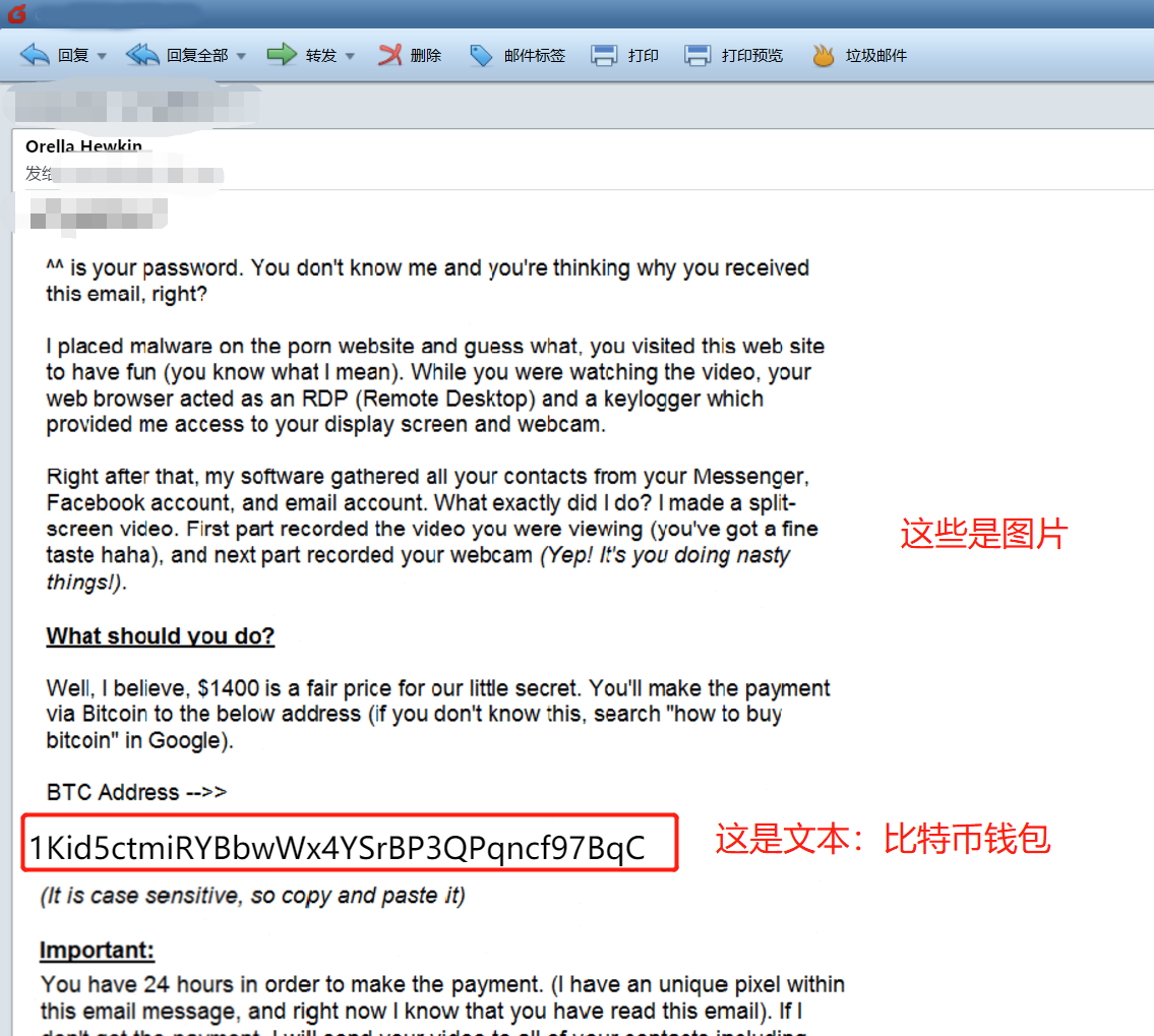 再看邮件正文,上面是图片,下面也是图片(他连字都不愿意写),中间是一个比特币钱包地址,应该是这个行业内通用的诈骗模板,直接换上自己的钱包地址就群发了。