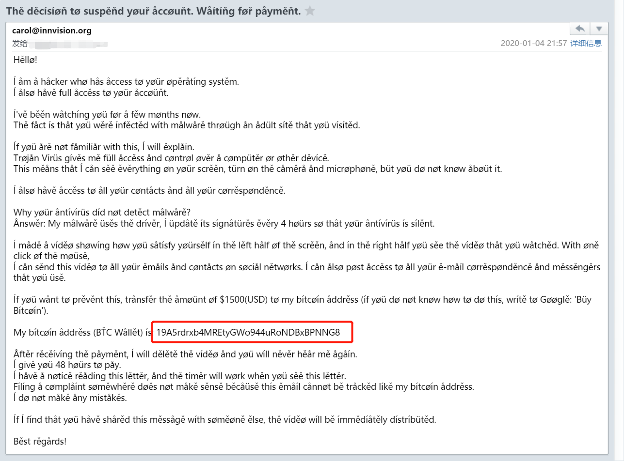 我经常收到很多垃圾邮件,甚至还有比特币的勒索邮件。大意是,我在访问某些色情网站时,被网站的病毒入侵了,并且保留了我的观看记录。我必须支付给他们一些比特币,他们就删除记录,否则就会发给我的家人。