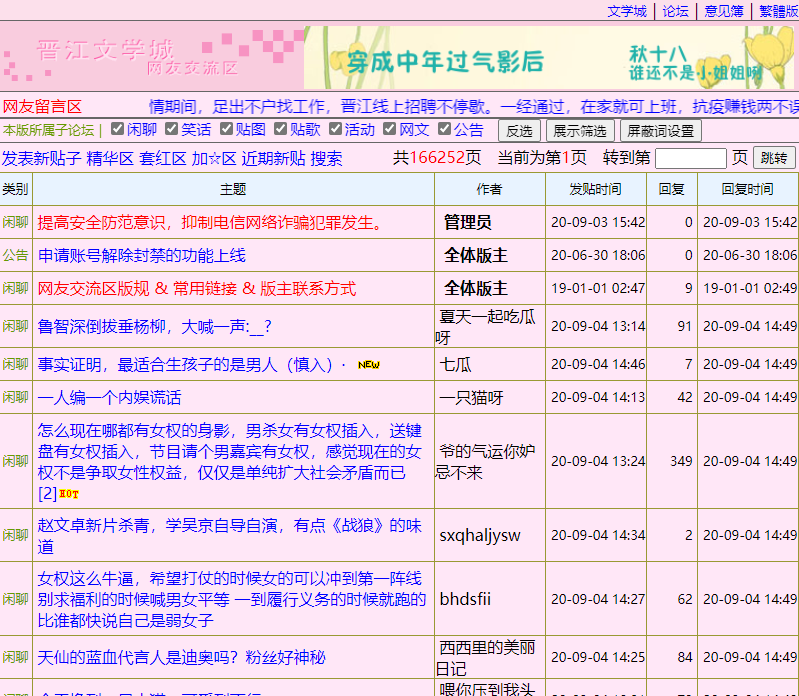 感觉连当时的论坛都比他要新颖时尚,这个论坛就像更早的留言板风格,但他的活跃度却还不错,主要是文学城的一些读者和粉丝会来这里交流。