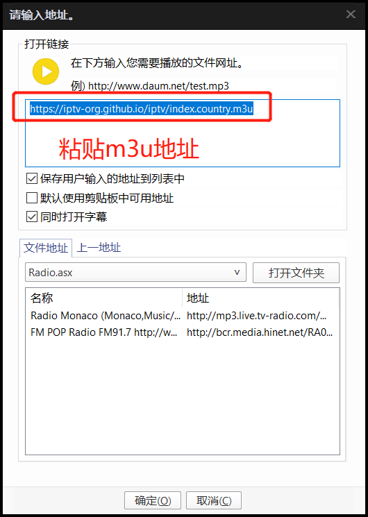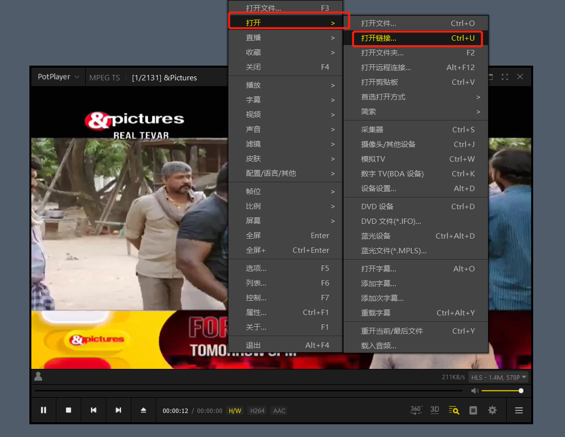 举个栗子,我用的是potplayer(vlc太难用)。打开软件后,在画面右击,选择打开->打开链接