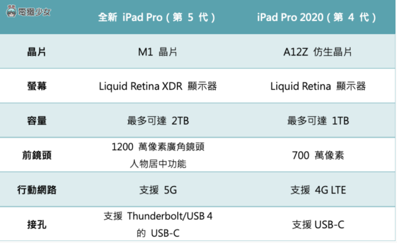 以外观来说,新款的iPad Pro 沿用和2020 相同萤幕尺寸和配色,不过在重量和厚度上,都是12.9 吋的M1 iPad Pro 居冠,而在接孔的部分,新款的iPad Pro 也升级成支援Thunderbolt/USB 4 的USB-C 接孔,提升外接装置的相容性和传输速度,更能符合需要大量传输资料使用者的需求