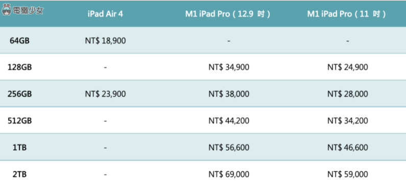 最后帮大家整理iPad Air 4 和两种新款iPad Pro 的价格,如果你想追求更好的影音体验,或就是想要拥有一台M1 的新iPad,可以考虑加个1000 元,从256GB 的iPad Air 4 升级到128GB 的iPad Pro,可以说是拿容量大小,来换更好的效能、前镜头,还有新功能!