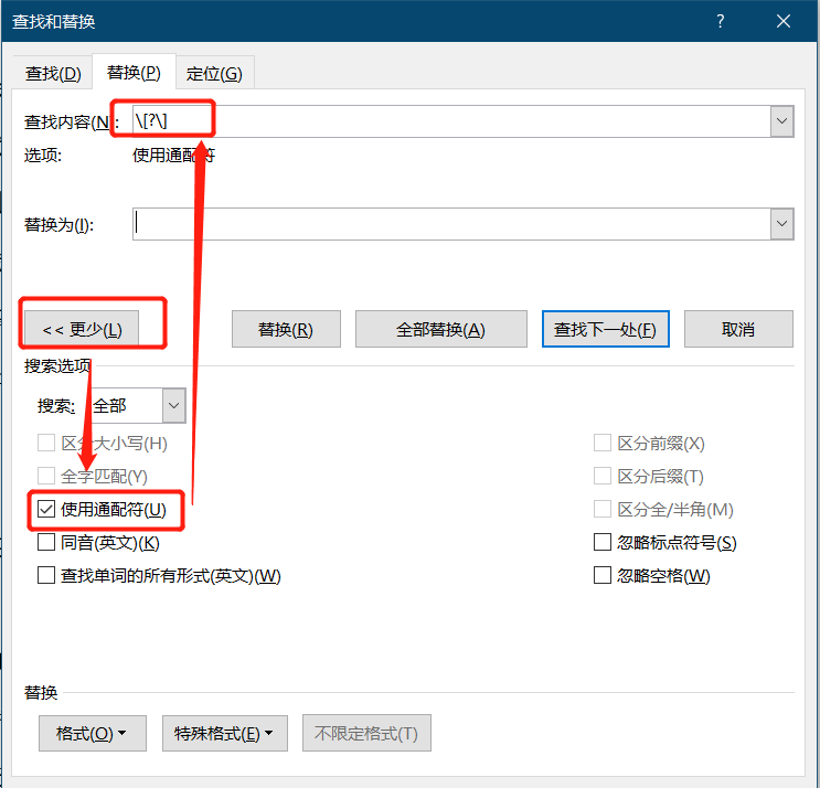 点击“更多”,“使用通配符”,然后在查找内容栏内写入 \[?\] ,这段代码的意思是查找方括号内包含1个任意字符的字符串。因为方括号[]也是通配符的一种,所以此处必须使用转义字符\来进行标记\[,这代查找[这个字符。