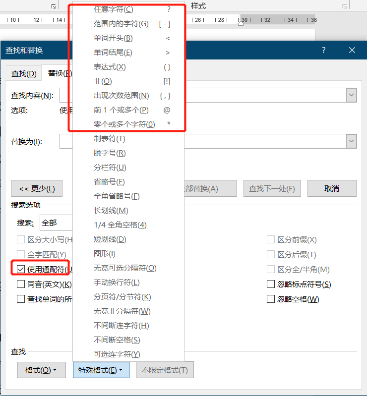 当勾选了“使用通配符”选项后,下方的特殊格式里就会出现一些可用的通配符,具体作用都有描述。下面在演示一个通配符的应用。