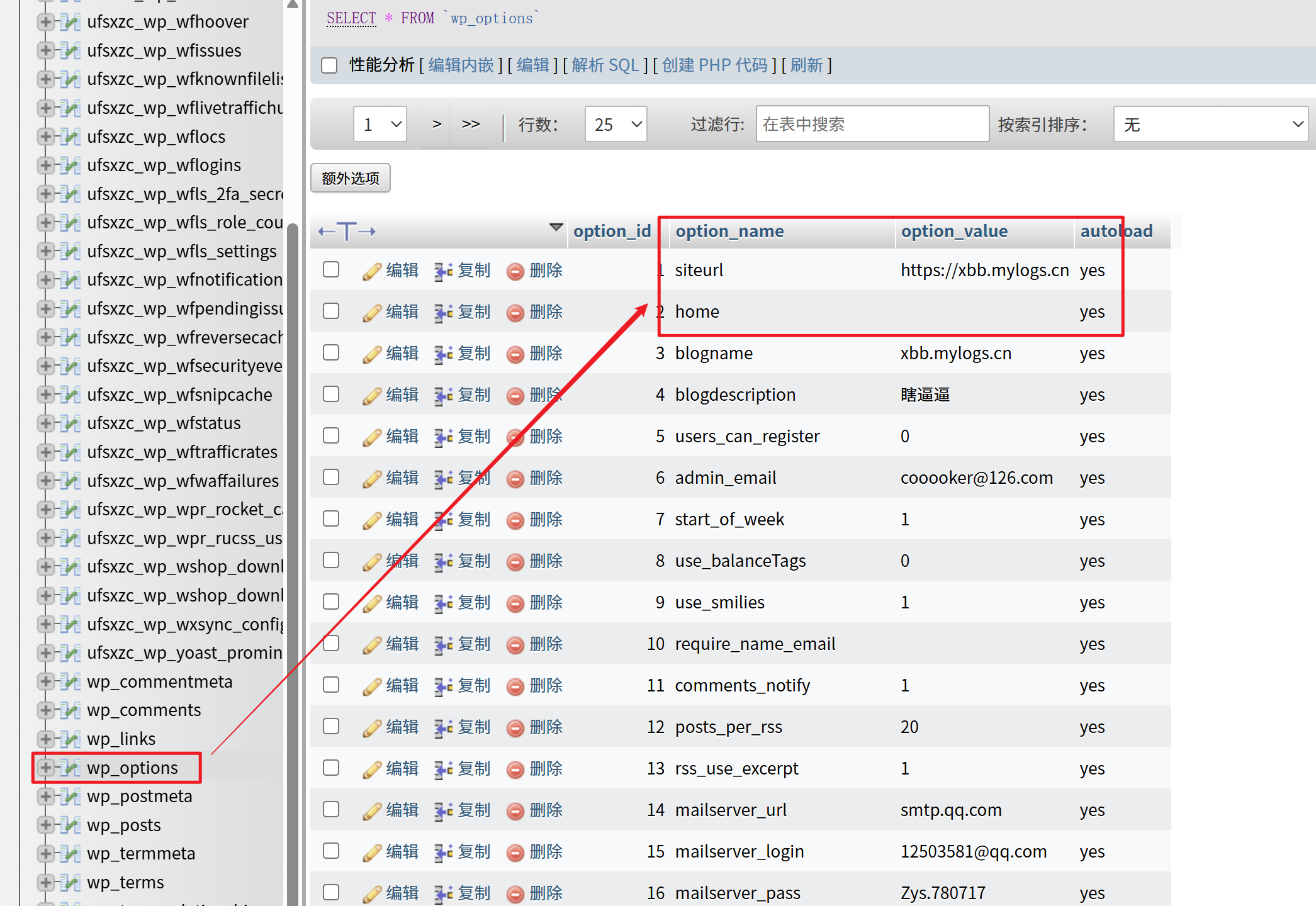 不出意外的话,网站首页应该能正常打开,但其他连接应该是不对的,熟悉wordpress的朋友应该知道,wp站更换域名后要修改数据库的中的几个字段,就是wp_options表里的,还有一些其他资源也可以修改适配,但最重要的就是options表的字段值要修改。