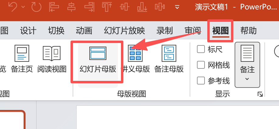 1、打开PPT,点击“视图”按钮,及“幻灯片模板”