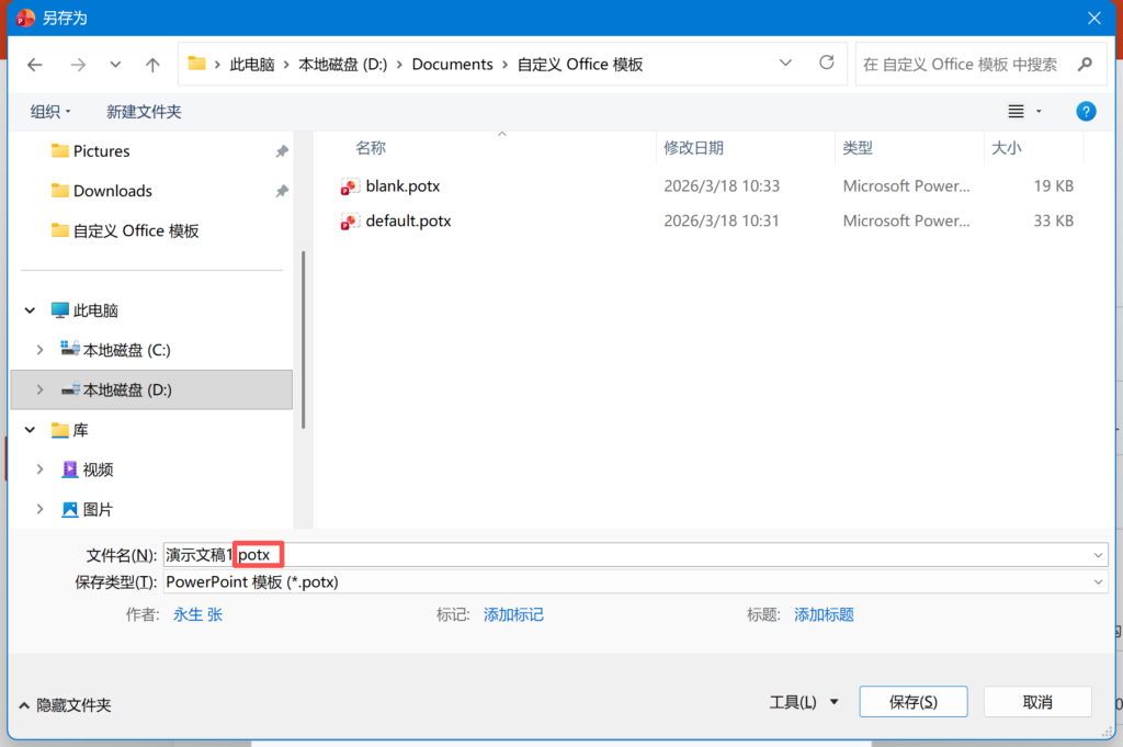 要把当前文件另存为potx模板文件,名称必须为:blank.potx,保存位置任意。