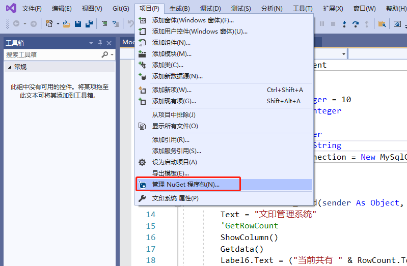 启动项目后,选额菜单:项目--管理NuGet程序包。