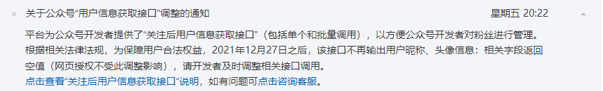 2021年12月24号晚8点多,微信公众号后台发消息说,以后微信开放平台将不提供用户头像和昵称了。原通知如下: