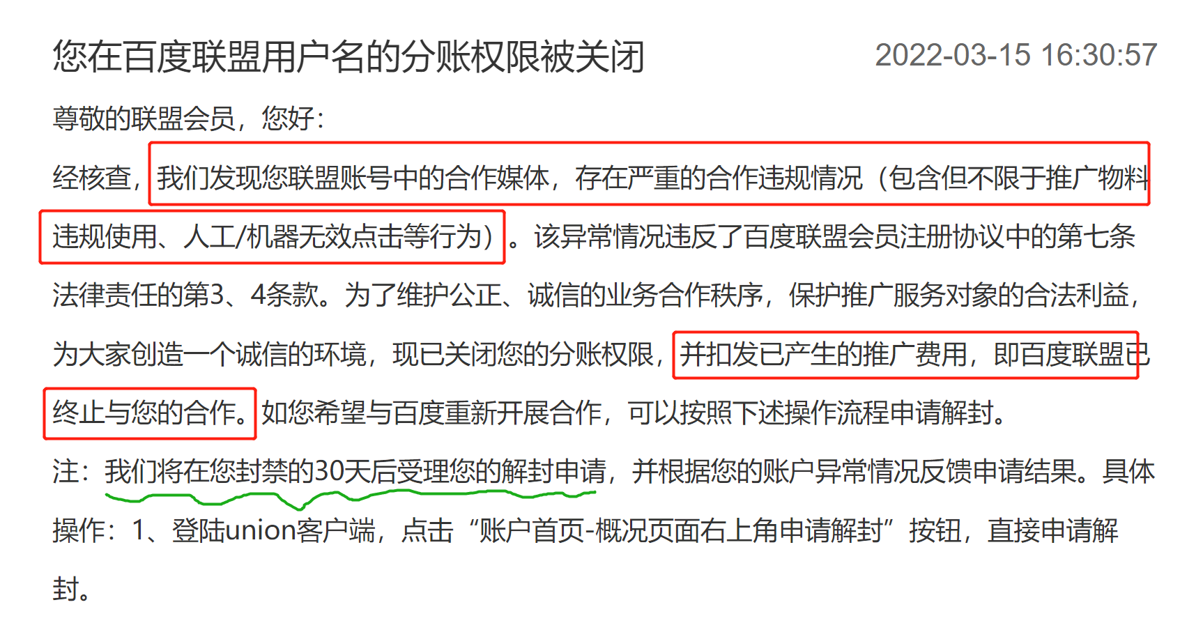 2022年3月15日,我收到百度联盟的一封站内信,说我的“存在严重的合作违规情况(包含但不限于推广物料违规使用、人工/机器无效点击等行为)”。