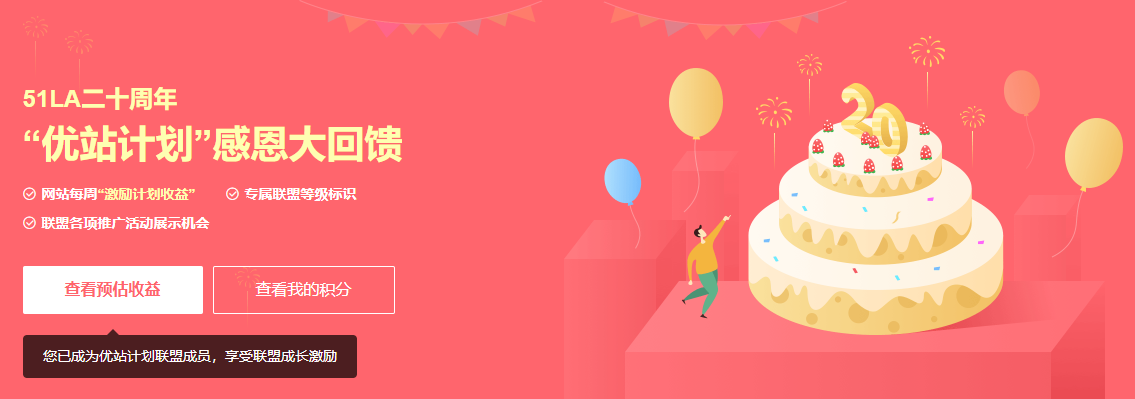 “优站计划”又称优质站长联盟计划,是 51LA 在二十周年推出的感恩回馈活动,助力站长运营网站,加入该计划的站长们可以通过不断优化自己的网站,获取由 51LA 提供的收益奖励。