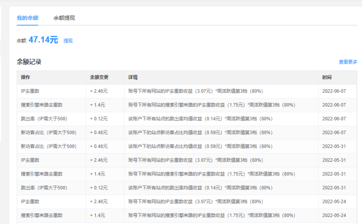 本来我想着51.la可能只是用发钱来诱饵,忽悠广大站长来用他的统计系统,但最近登录才发现,原来真的有钱赚,下面是我账号截图,我有个网站,流量都一般,所以也没什么收入。