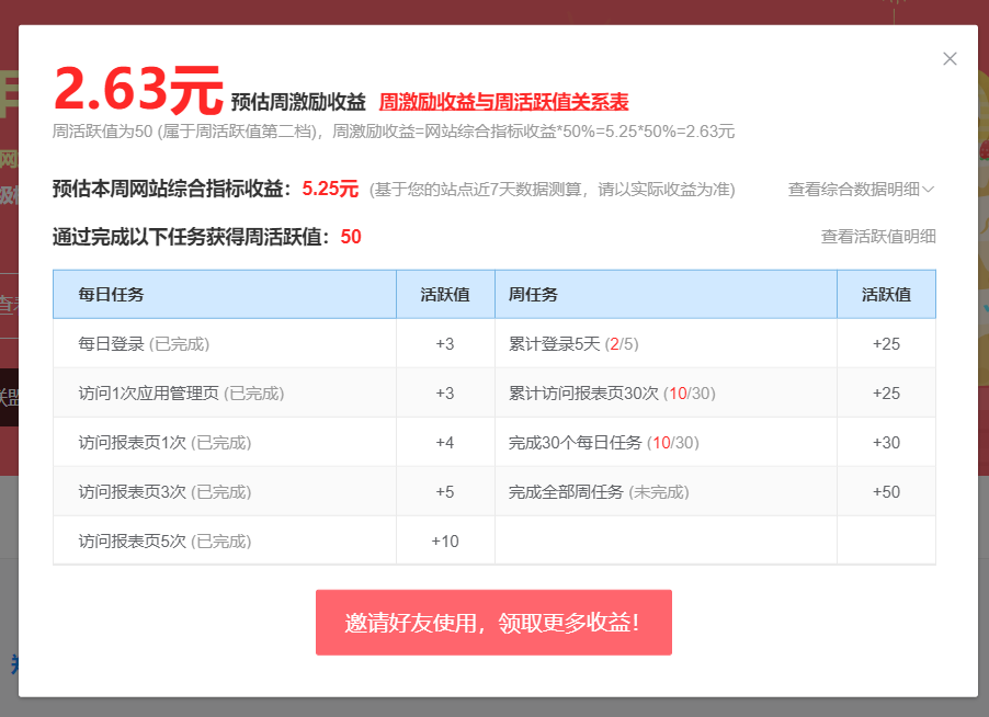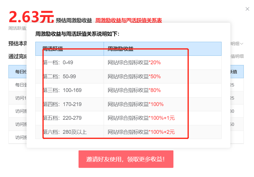 从上图可以看出,登录、访问报表都是任务,只要坚持做,活跃值就高,活跃值高,每周的收益也就高。下面是活跃值和收益的关系。