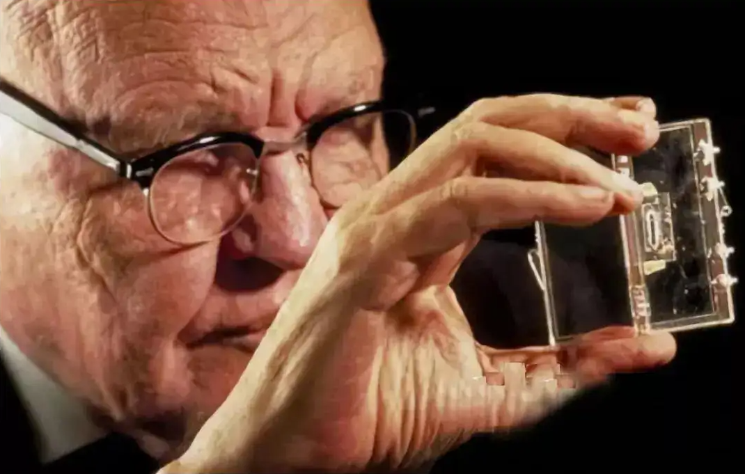 1958年9月,Kilby用锗(Ge)做出了一片仅仅只有7/16英寸乘1/16英寸的元件,这个元件的功能很简单,就是产生正弦波。人类史上的第一片集成电路就这么诞生了。有趣的是,第一片芯片用的是锗,而非硅。一开始业界根本不觉得有什么价值,只有美军对这个的概念有兴趣,Kilby自己也说:“在当时,这只是科技会议上大家娱乐用的话题而已。”但还好有美军支持。