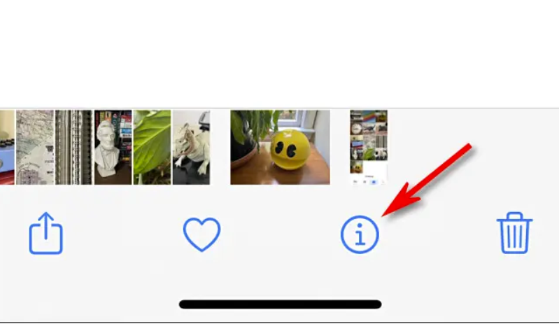 在详细查看照片时,在照片图像上向上滑动,或点击“信息”按钮,该按钮看起来像一个圆圈中的小写“i”。