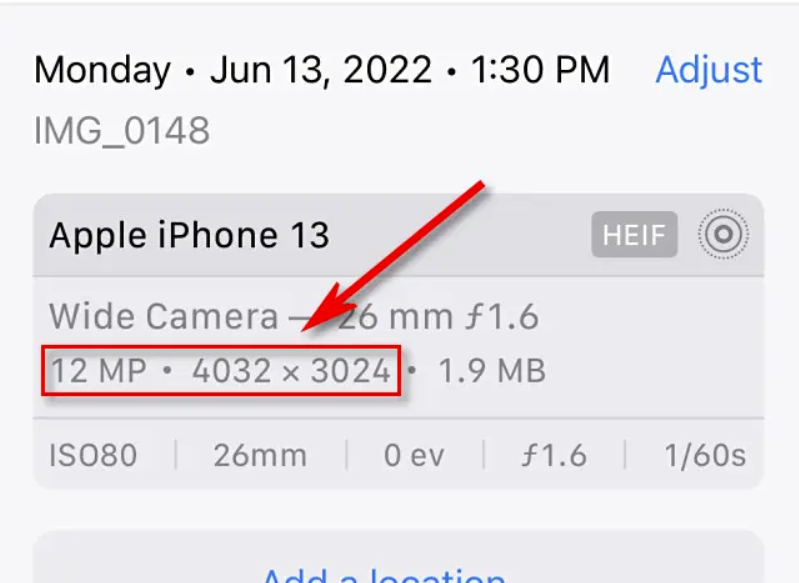 点击信息按钮后,屏幕下方会出现一个小框,其中包含照片元数据。您可以在第二行看到图像分辨率和图像尺寸,例如“12 MP”和“4032 x 3024”。