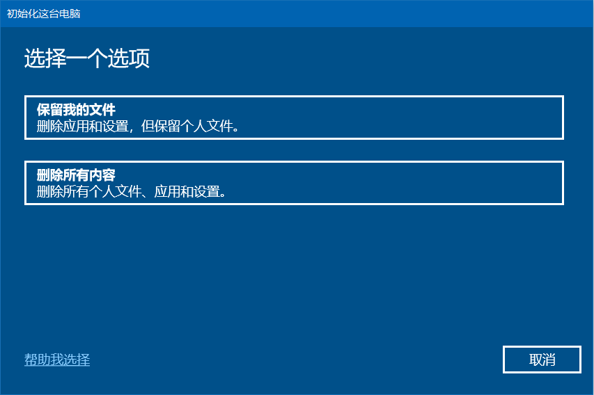 在初始化的对话框中,选择是否保留个人设置,第一个选项会保留个人文件,包括:/user下的文件还有系统设置,如果你的系统只是应用有问题,可以选择这一项。第二项会删除所有文件,包括应用和个人文件及配置,要注意的是:默认是删除windows系统盘的文件,如果需要把整个硬盘都清空,可以在下个对话框设置。