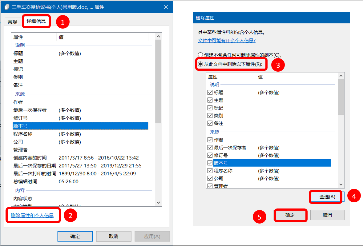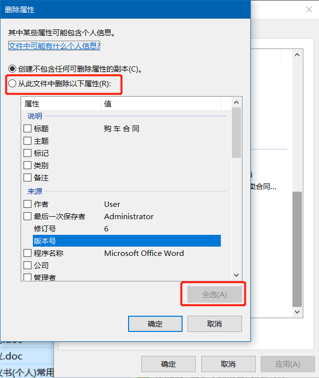 在弹出的对话框中,选择“从此文件中删除以下属性”,然后点击对话框下方的“全选”按钮,当然,你也可以选择一部分数据,然后,点击确定,这些信息就删除了。