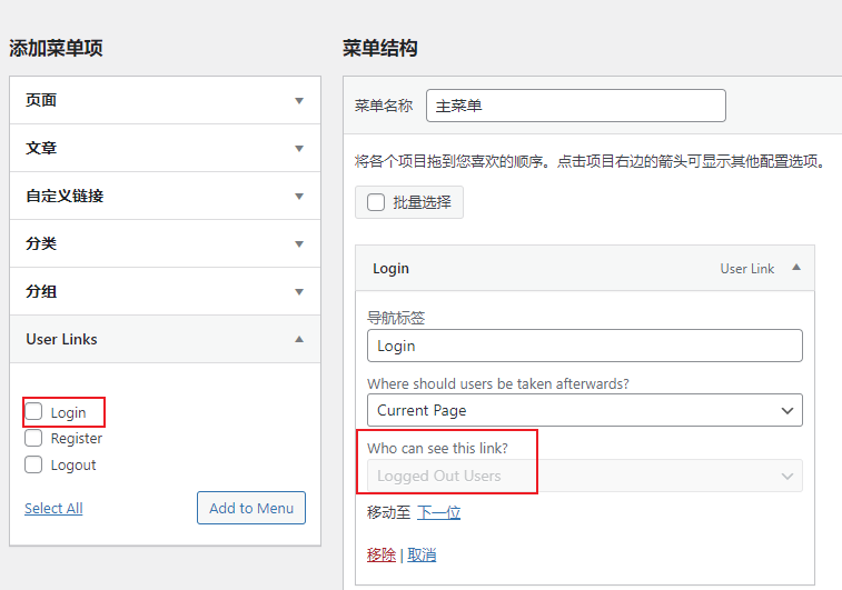 选择其中一个添加,可以看到,在原本菜单编辑界面多了“Who can see this link?”,Login的选项是 “Logged Out Users”,并且不可修改,意思登出的用户可以看到。至于后面的 Register 和 Logout道理是一样的。
