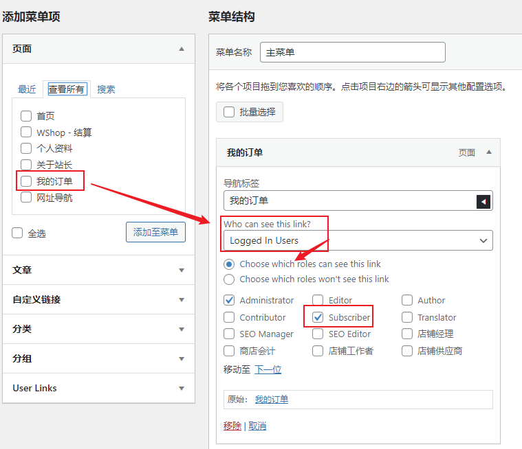 我的订单是一个自定义页面,先把它添加到菜单中,然后选择“Who can see this link?” 选择 "Logged In Users" 意思是登录用户可以看见。然后选择 “Choose which roles can see this link?” 选择哪个角色可以看到这个链接,我选择 Administrator 和 subscriber ,管理员和 订阅者,因为订阅者也有权购买产品。
