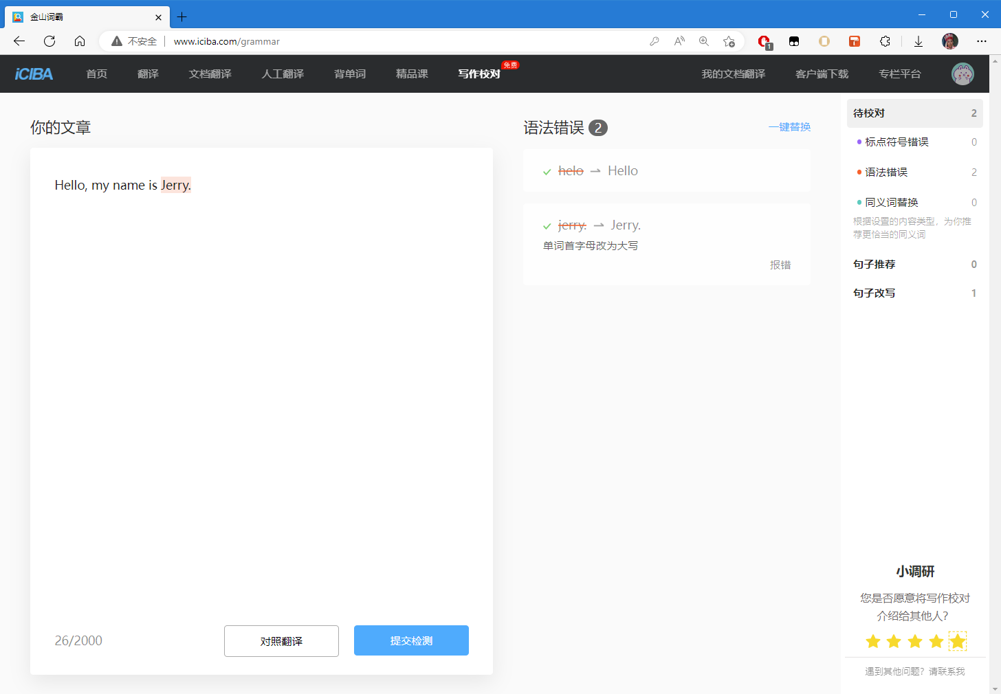 今天偶然发现了金山词霸推出了一款英语语法校对工具,功能grammarly看起来一摸一样,而且是免费的(至少现在看起来是的),至于以后是否收费就不一定了,不过金山词霸这么多年了,从产品质量到服务都是很棒的,堪称业界良心。下边先看下界面