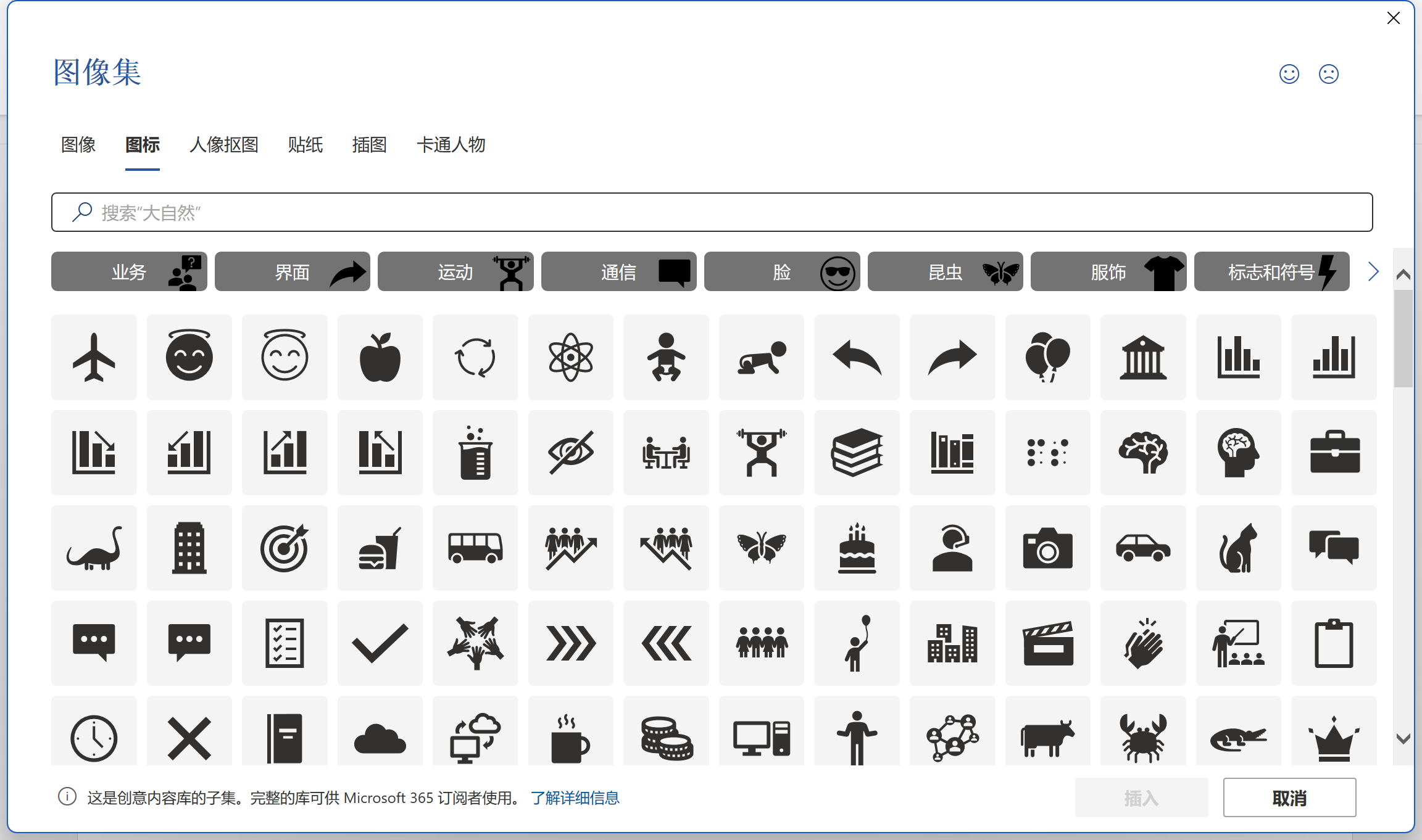 不过要注意的是,这些图标和插画都是保存在微软服务器上的,插入时可能会慢一点,但国内基本都能正常访问和下载了。而且只要插入到文档中了,就不用担心网络问题了。