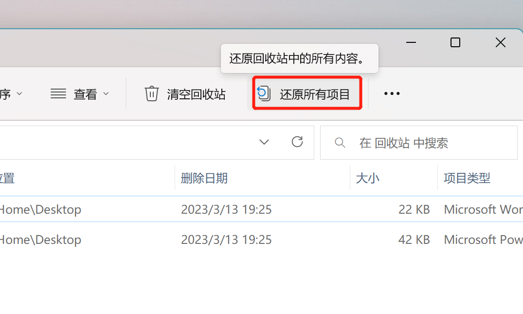 我以为微软应该早就抛弃这个功能了,没想到,更新到windows11了,这个功能居然还在,而且我刚刚把垃圾桶里的文件“全部还原”了,还好不多,我又一个个删除了。