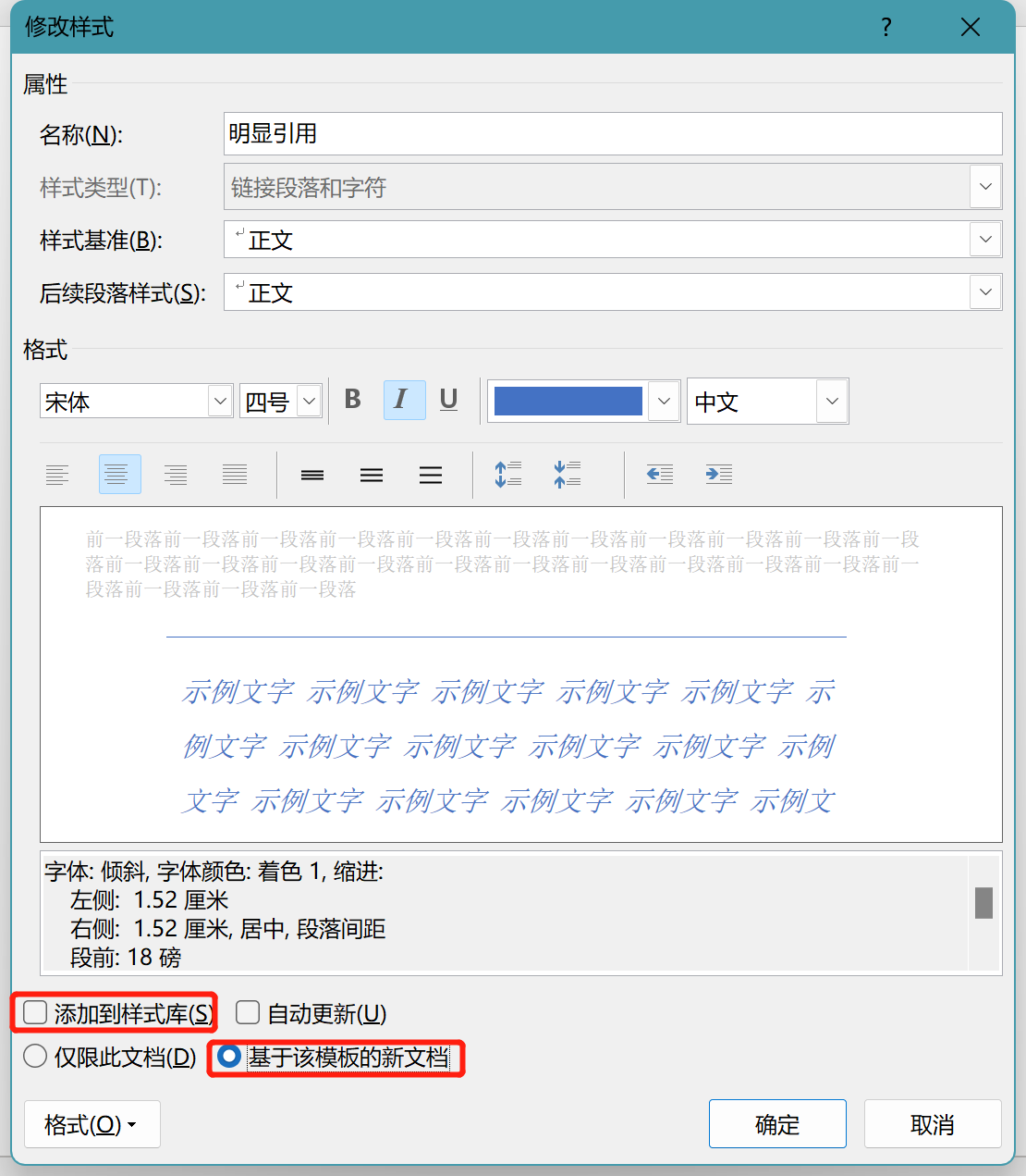 2、在弹出的“修改样式”对话框中,取消“添加到样式库”前面的勾选,然后再选中“基于该模板的新文档”。