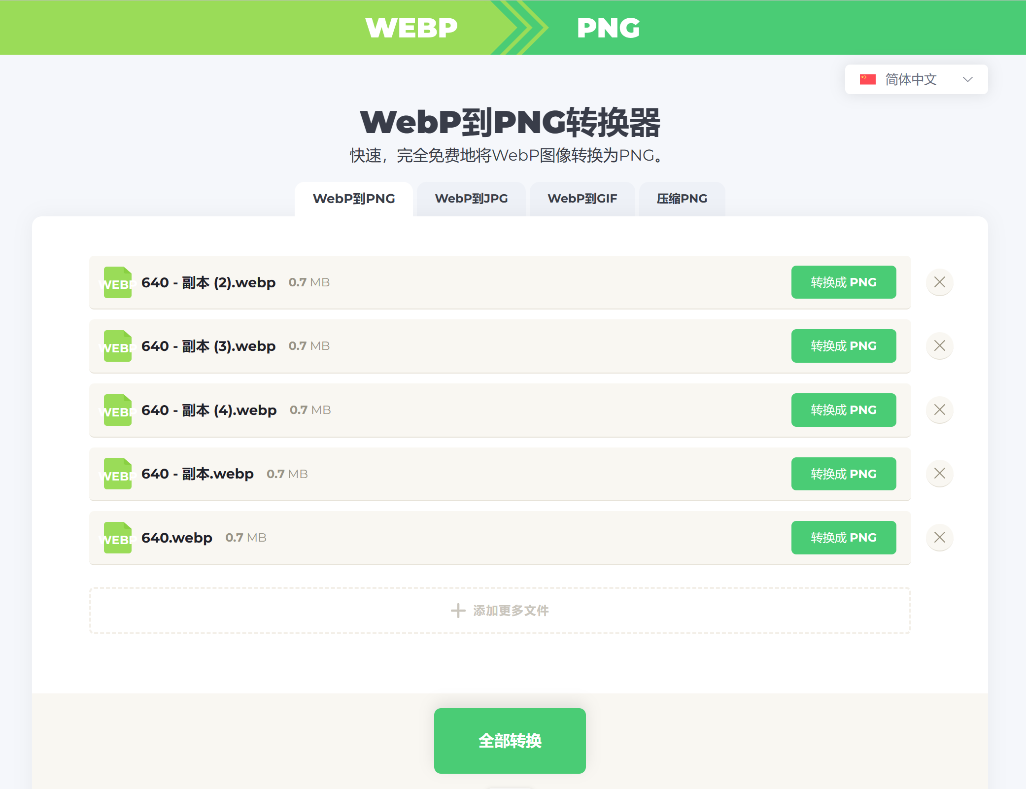 或者把这些文件拖拽到绿按钮下方的白色区域也是一样的。然后选全部转换。