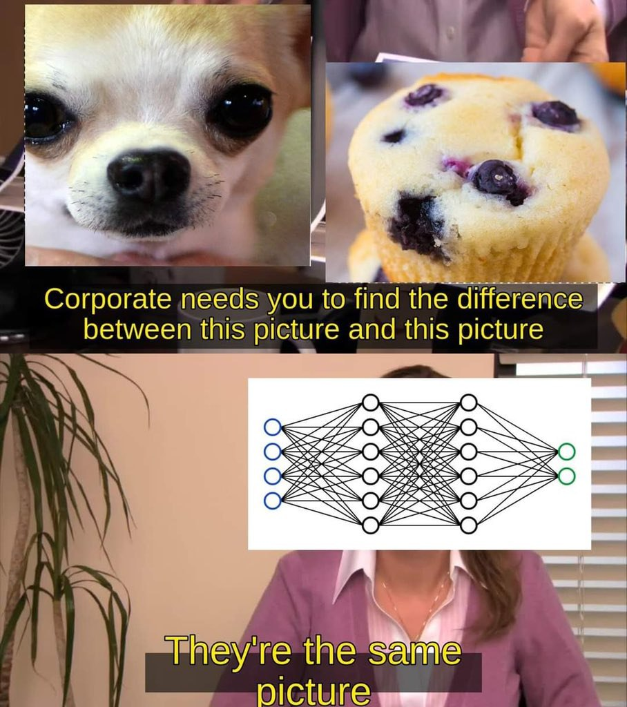 注:一个是蛋糕,一个是狗。不过只要训练数据足够多,AI是能解决这个问题的,虽然谁也不知道怎么解决的。
