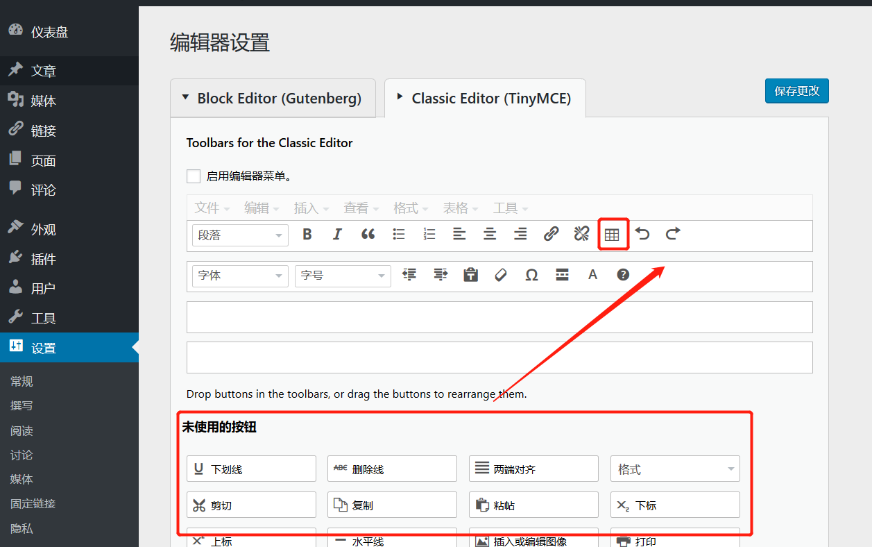 在插件设置页面,有古腾堡编辑器和经典编辑器两个设置页。我选经典编辑器,在这页的下面有很多功能按钮可以拖拽到上面的工具栏上。现在把表格按钮拖放的指定位置,保存。就ok了。