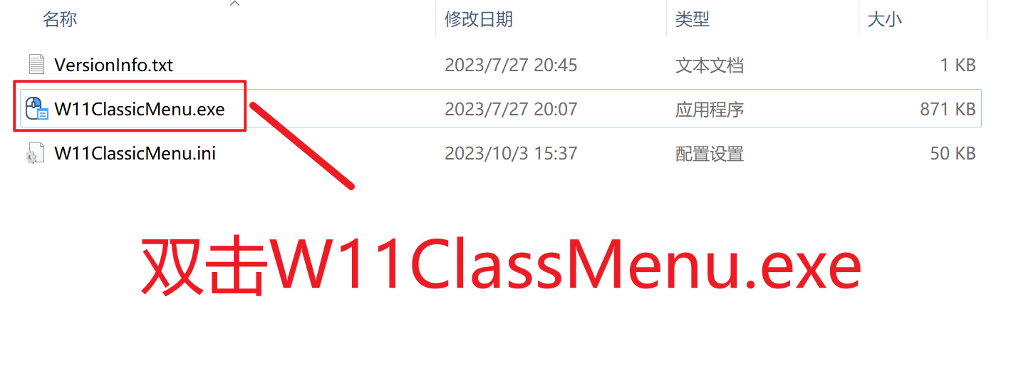 下载后的工具包含3个文件,双击W11ClassMenu.exe