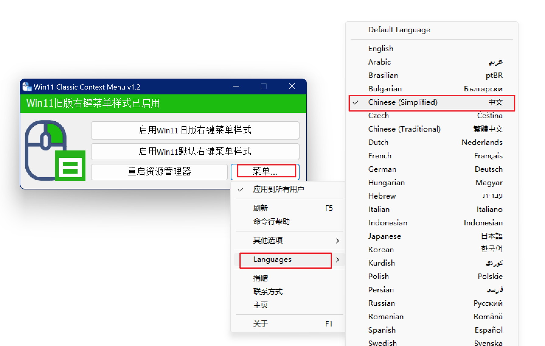 点击“Enable Win11 Classic Context Menu Style”或“启用win11旧版右键菜单样式”