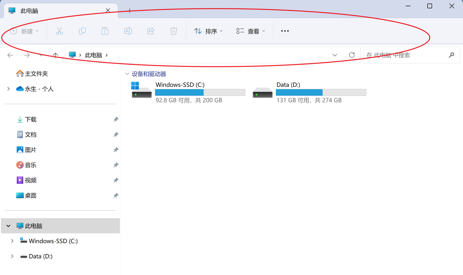这次更新(2023年10月的一个更新,忘了补丁号了,这可能是个预览版补丁)让我最不爽的是windows11的资源管理器又变样了。Windows11刚出来那会,资源管理器上面是工具栏,下方是地址栏和搜索,地址栏和搜索都比较小,看起来窗口比较协调。