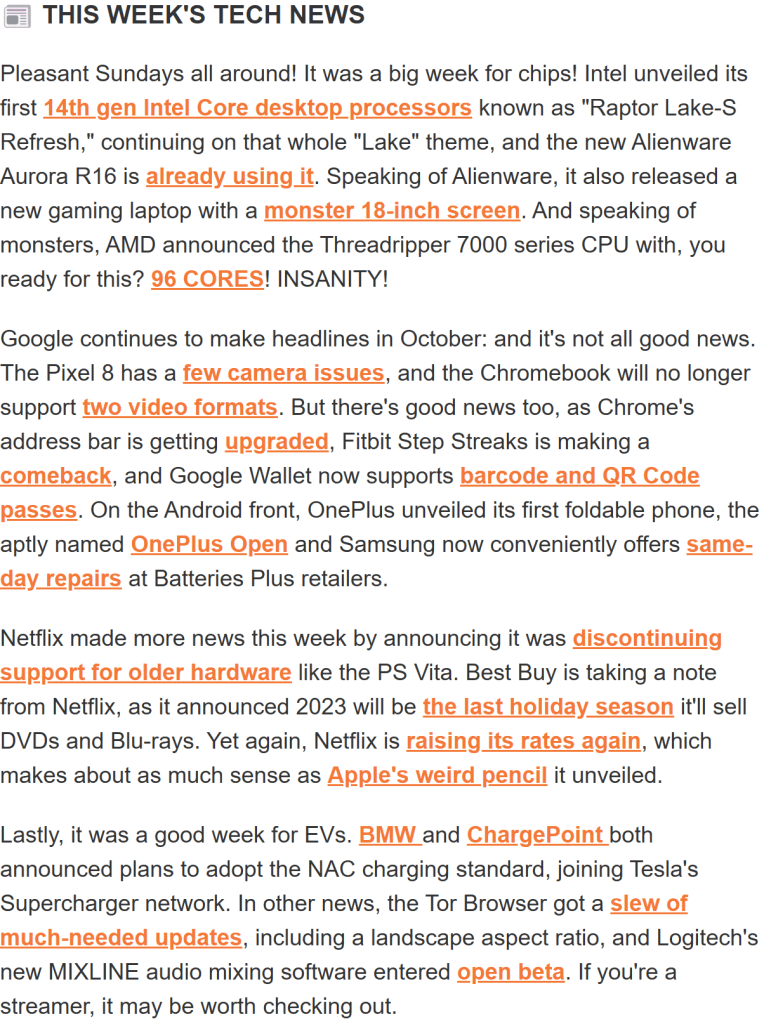 Pleasant Sundays all around! It was a big week for chips! Intel unveiled its first 14th gen Intel Core desktop processors known as "Raptor Lake-S Refresh," continuing on that whole "Lake" theme, and the new Alienware Aurora R16 is already using it. Speaking of Alienware, it also released a new gaming laptop with a monster 18-inch screen. And speaking of monsters, AMD announced the Threadripper 7000 series CPU with, you ready for this? 96 CORES! INSANITY!