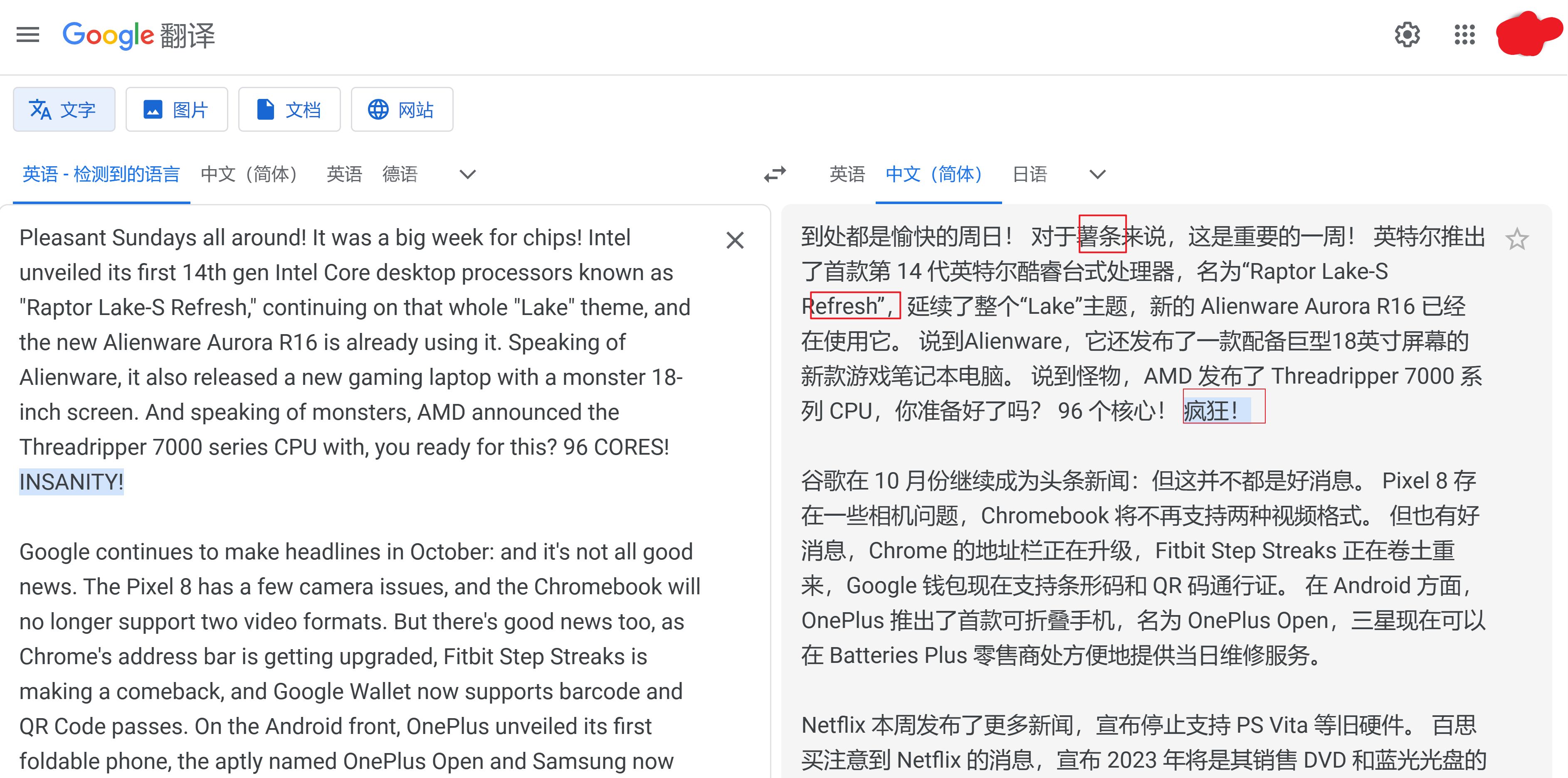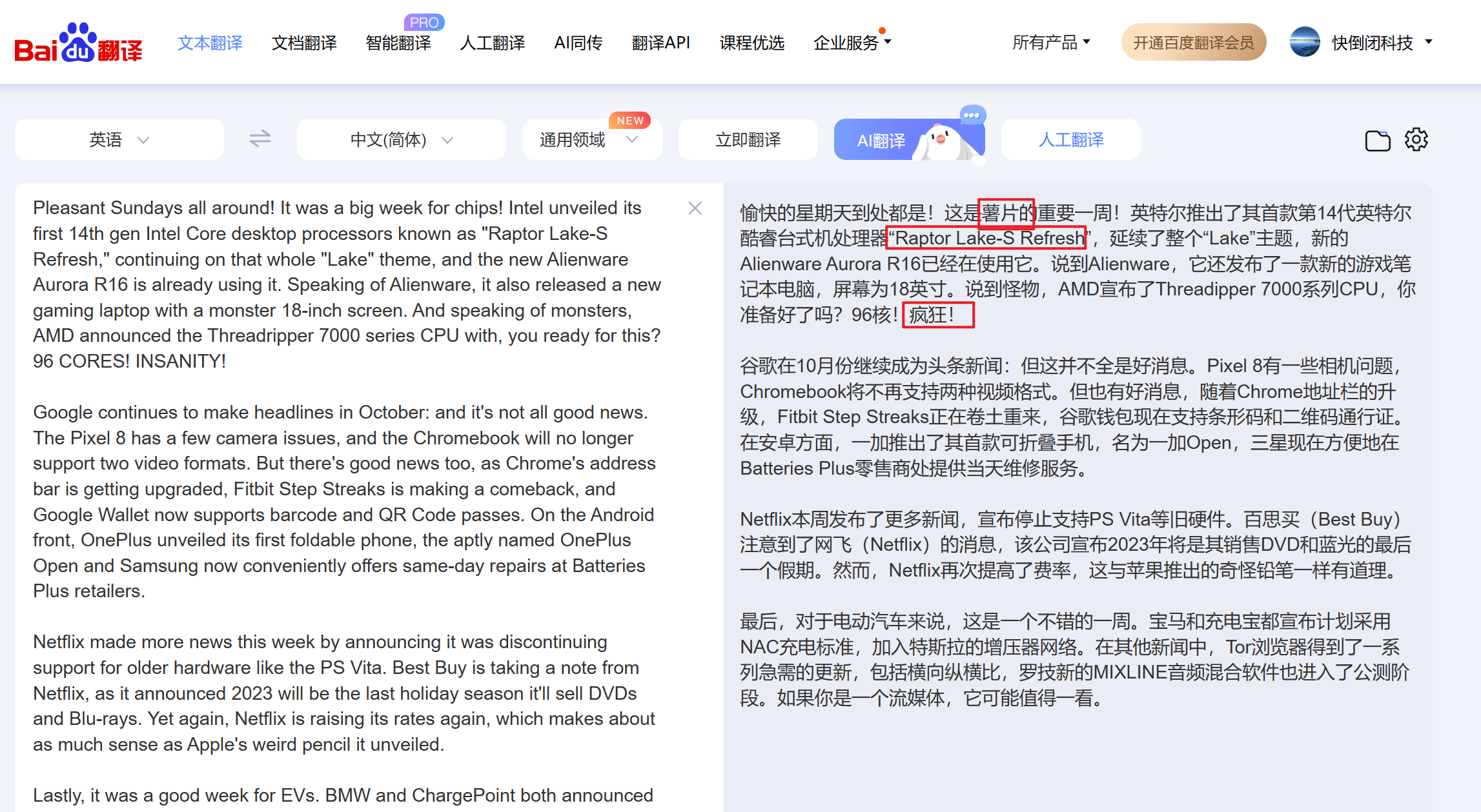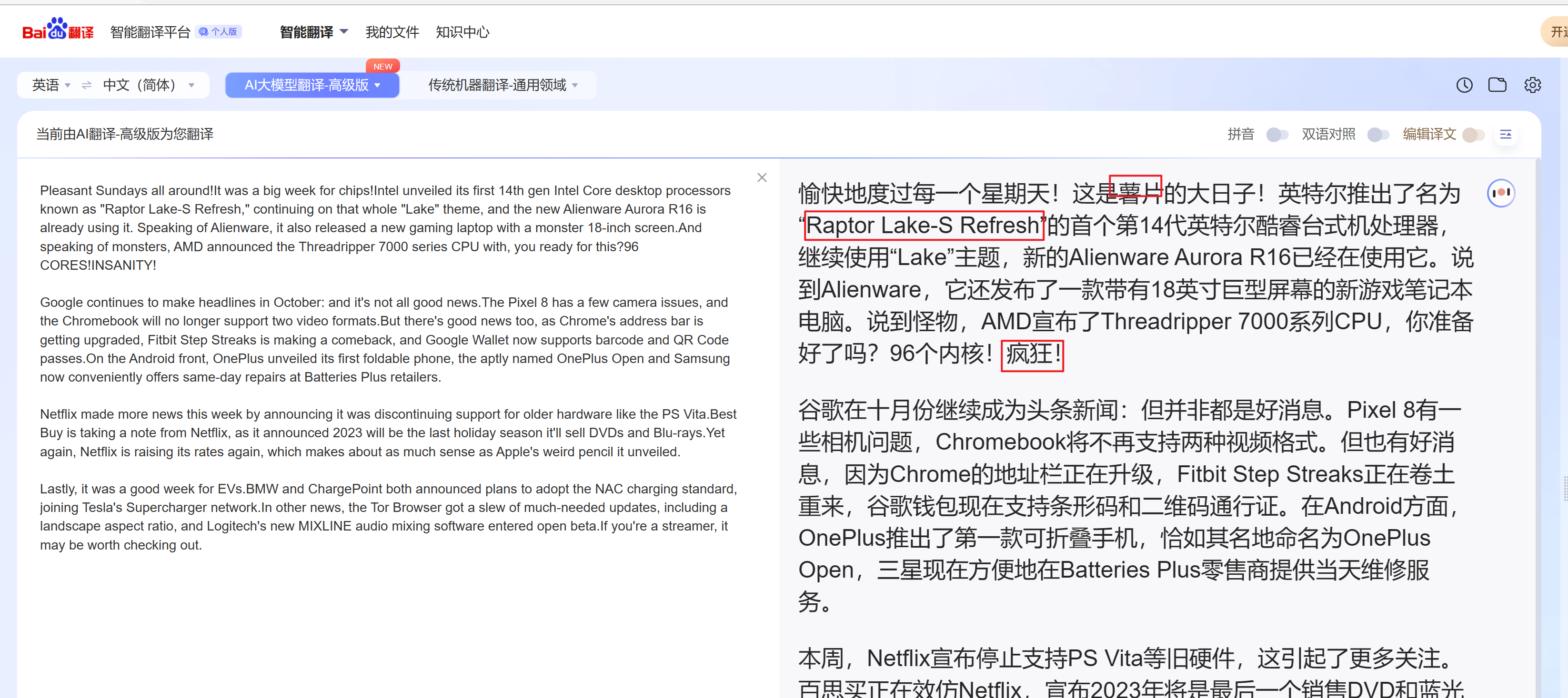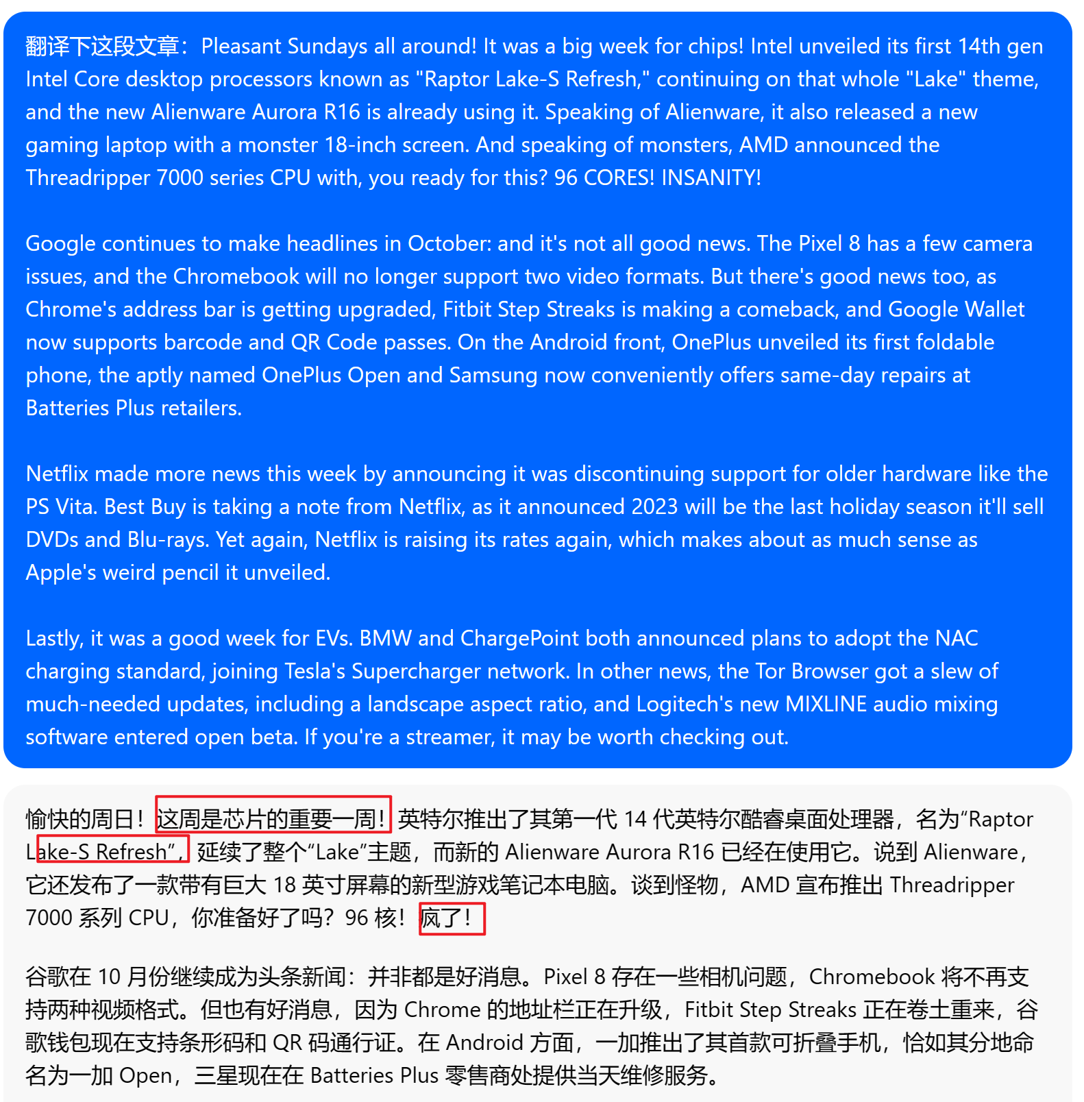 这是百度文心一言的翻译结果,chip能准确翻译了,但引号内专有名词也一并翻译了,这个不太好,但文心一言翻译的语句更通顺,看起来更自然,确实nice!