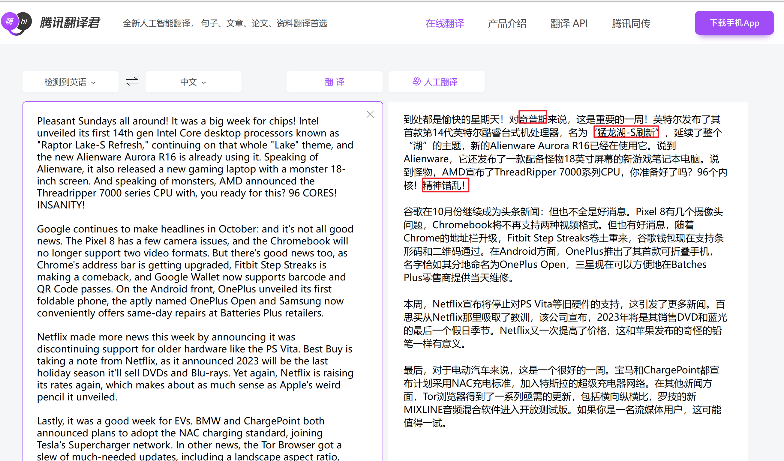这是腾讯的翻译,效果更惨,chip直接音译了,奇普斯!而且引号中的专有名词也翻译了,“猛龙湖-S刷新”,后面的insanity被翻译成了精神错乱,我看tx也有点精神错乱。