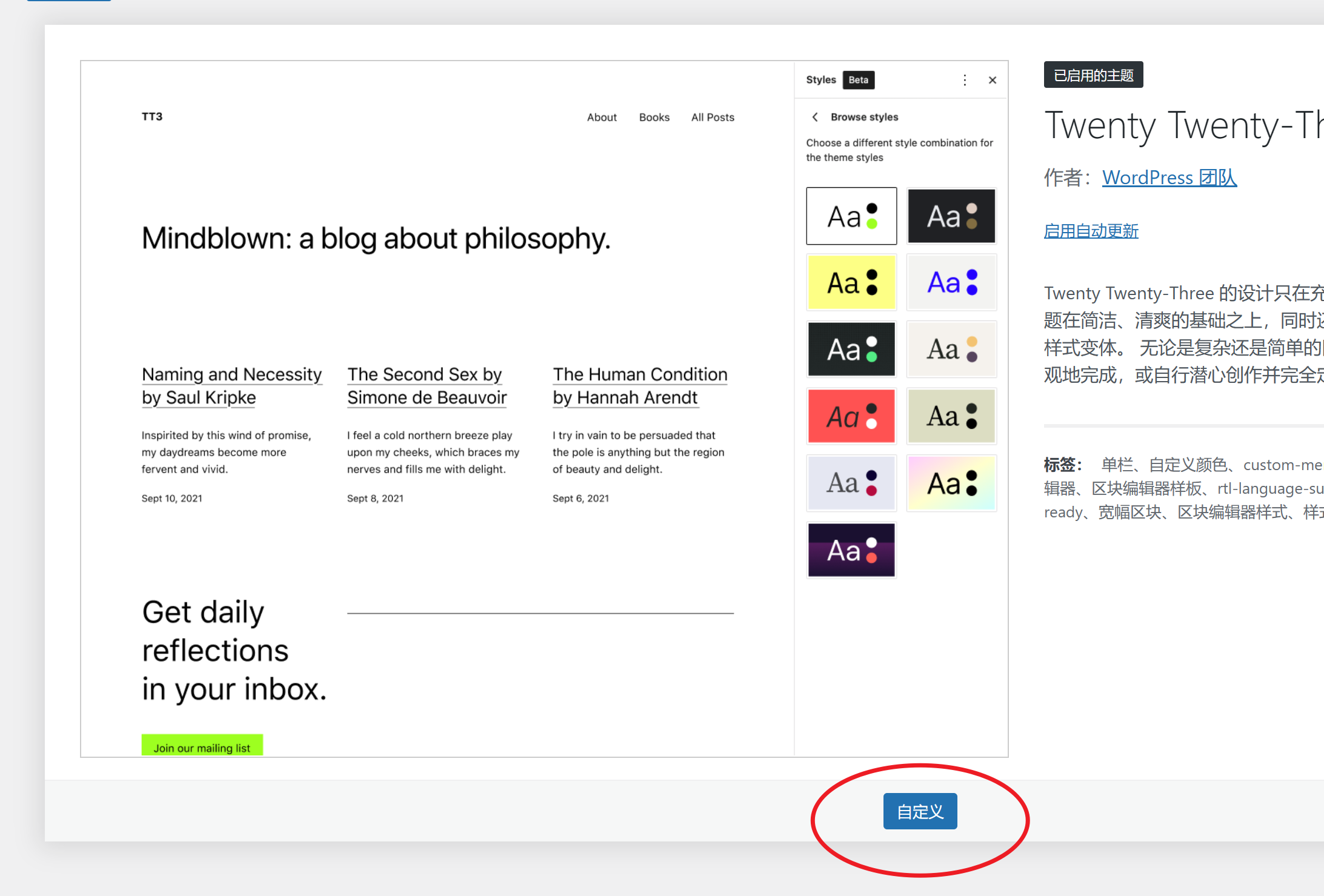 找到新版wordpress主题,点击自定义,我这用的是twenty-twenty-three,也就是2023版的官方主题,这个主题乍看起来什么都没有,但只要设计的好,什么他都能应付。
