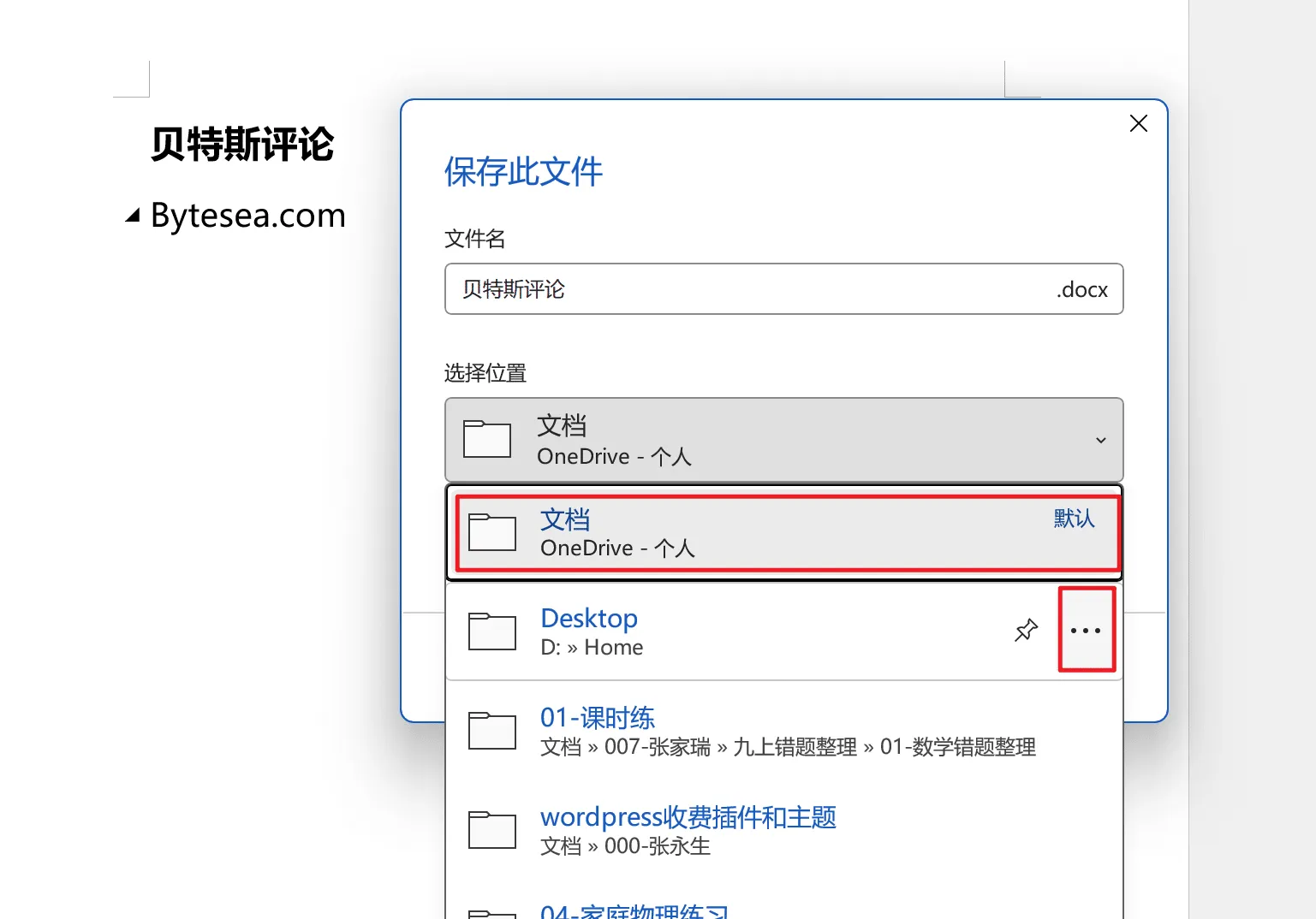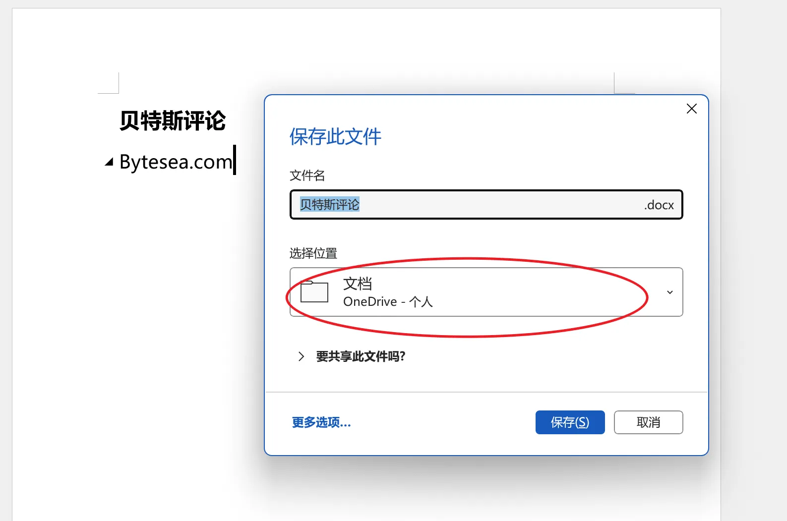 第一次保存word时,会出现保存对话框,点击“选择位置”,可以看到“OneDrive-个人”是默认的。