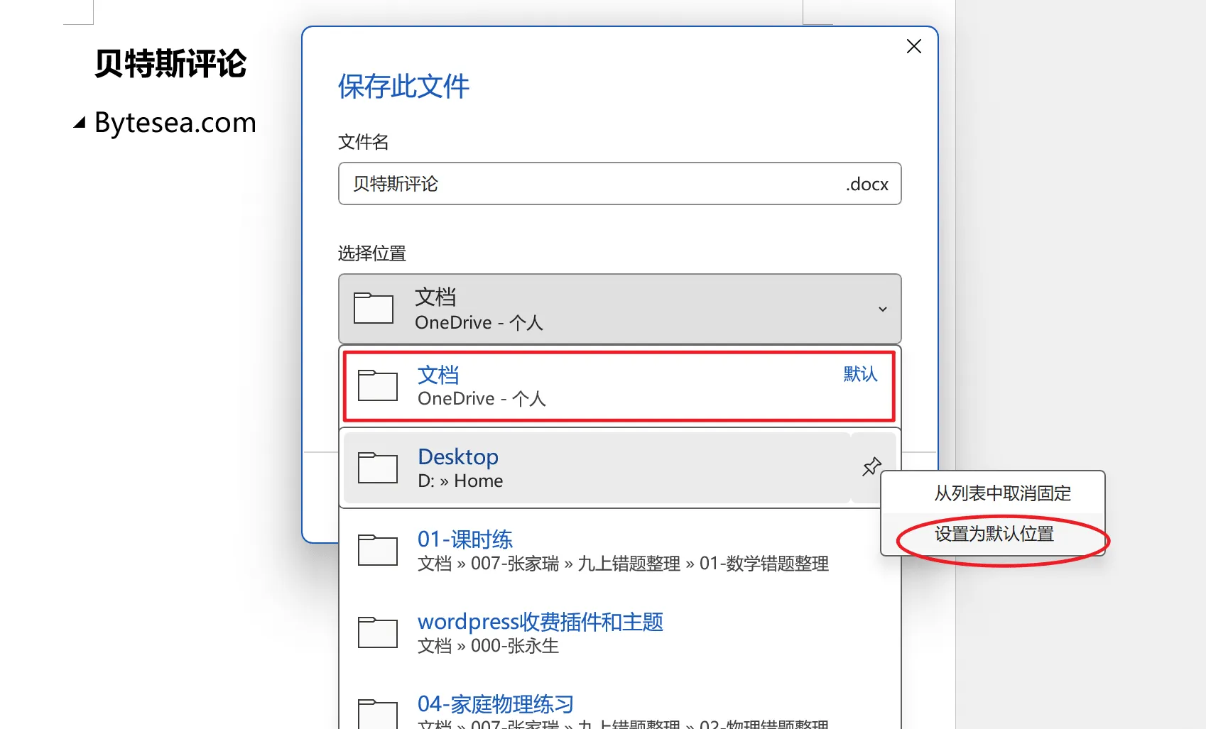 把新的路径设置成默认位置就可以了。下次在保存文档时,就会默认保存到这里了。