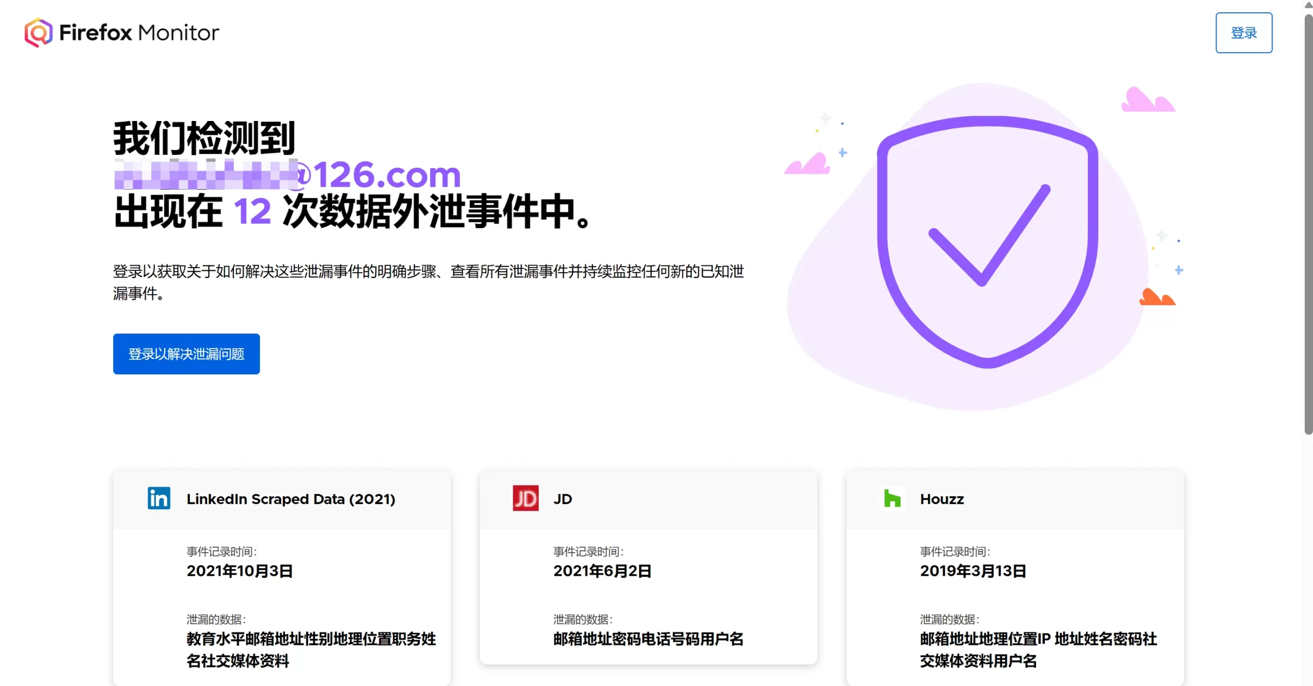 这是Firefox提供的一个安全工具,Firefox monitor。输入邮箱可以查看你的个人信息是否被泄露过。这应该算是个人版的社工库吧。